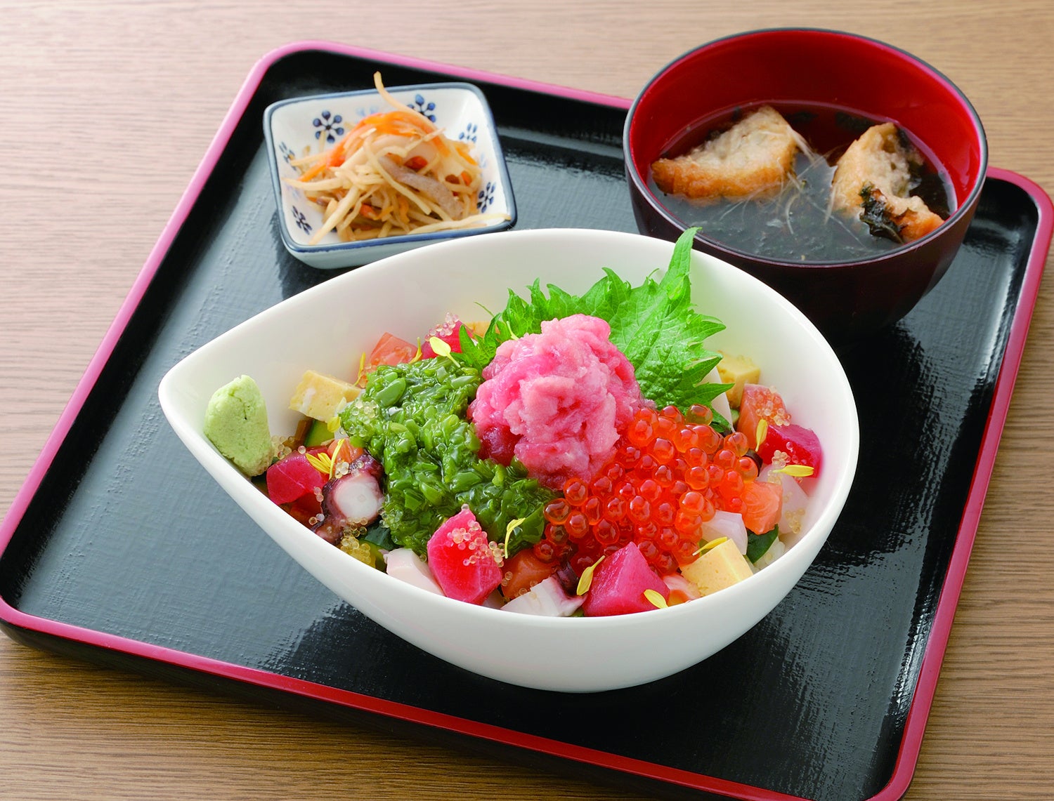 タコ、シラス、つぼ菜、メカジキなど11種類の具材の入った三陸の春を告げる豪華な丼です。