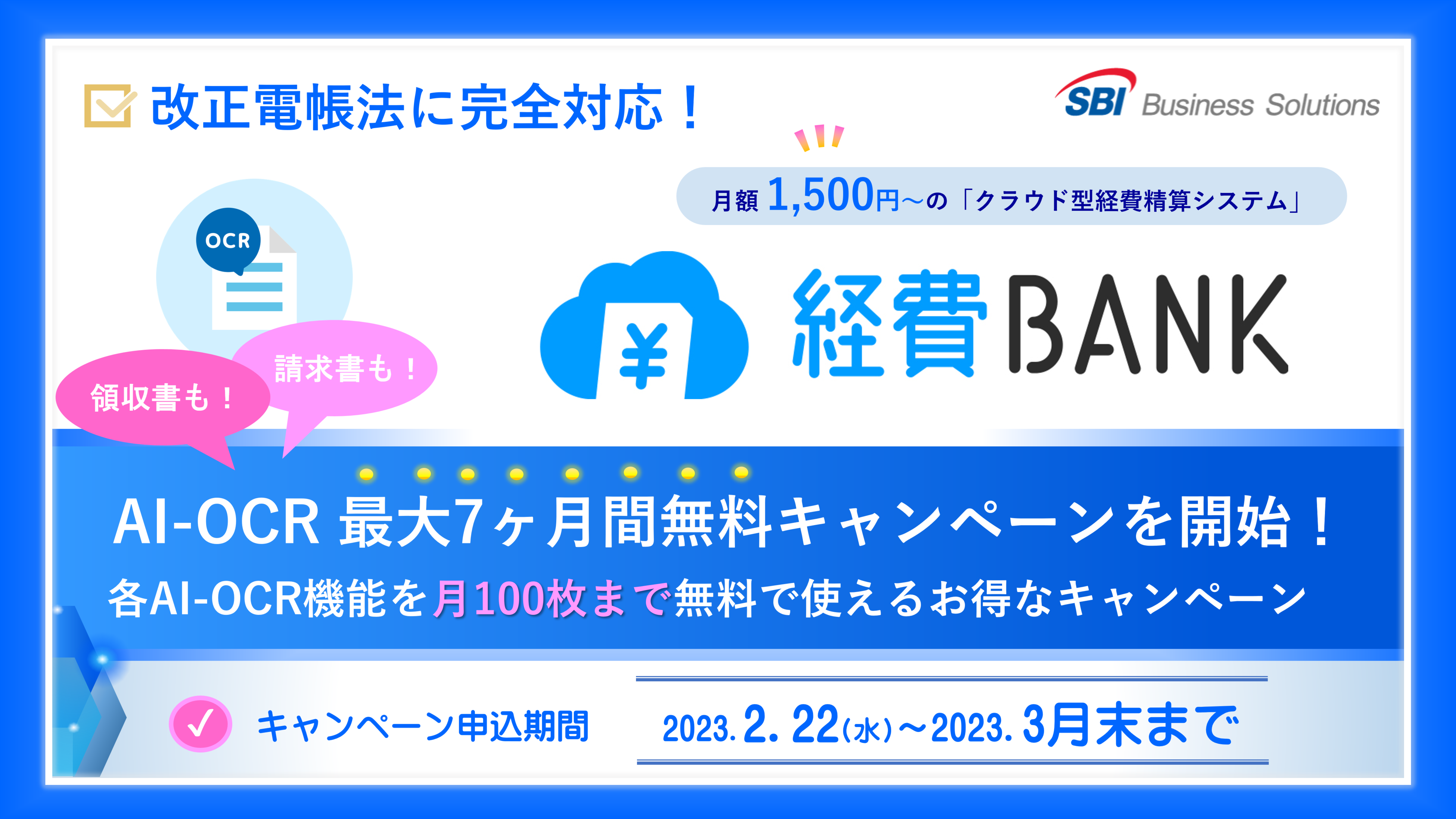 総合フィンテックソリューション企業であるSBI FinTech Solutions株式会社の子会社で、バックオフィス支援サービスを提供するSBIビジネス・ソリューションズ株式会社(本社:東京都港区、代表取締役社長:夏川 雅貴、以下「当社」)は、クラウド型経費精算システム「経費BANK」において、「領収書AI-OCR」及び「請求書AI-OCR」オプションを、それぞれ月100枚まで最大7ヶ月間無料で使えるキャンペーンを本日より開始しましたので、お知らせいたします。