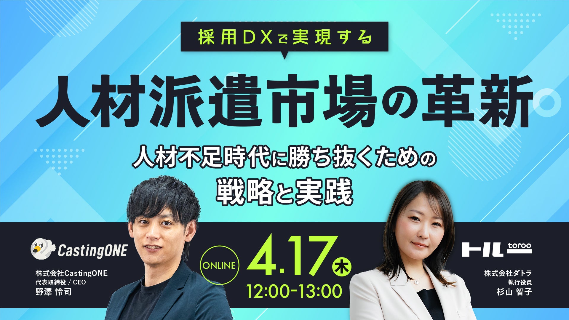 採用マーケティングATS「トルー」を運営する株式会社ダトラ(本社:大阪市中央区、代表取締役:草深悠介)は、株式会社CastingONEとの共催で、2025年4月17(木)、「採用DXで実現する人材派遣市場の革新 〜人材不足時代に勝ち抜くための戦略と実践〜」をテーマに、無料オンラインセミナーを開催いたします 。