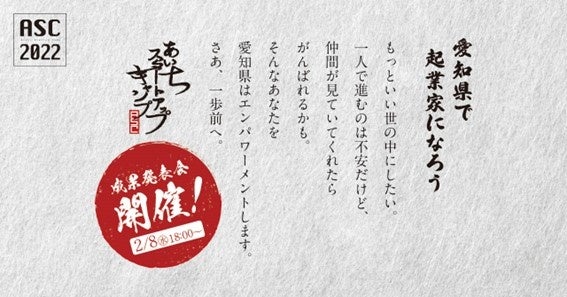 株式会社ツクリエ(本社:東京都千代田区 代表取締役:鈴木英樹 以下、ツクリエ)は、愛知県から受託し運営する起業家育成ワークショップ「Aichi Startup Camp 2022」の集大成として、「Aichi Startup Camp 2022 成果発表会」を、2月8日(水)にオフライン・オンラインで開催します。