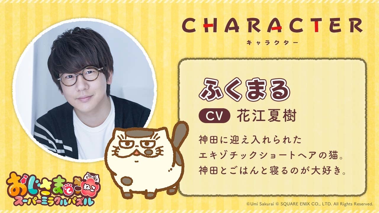 ふくまる役を花江夏樹さん、神田冬樹役を中田譲治さんが担当!ほか『おじ猫パズル』を彩る豪華声優陣が出演します。
