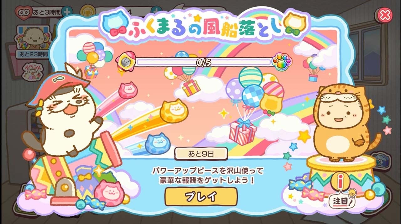 本日よりイベント「ふくまるの風船落とし」が開催!ミサイルを使ってイベントを攻略しよう!今回のイベント達成報酬、神田さんの「とらねこ着ぐるみ」をはじめ豪華アイテムをGET!