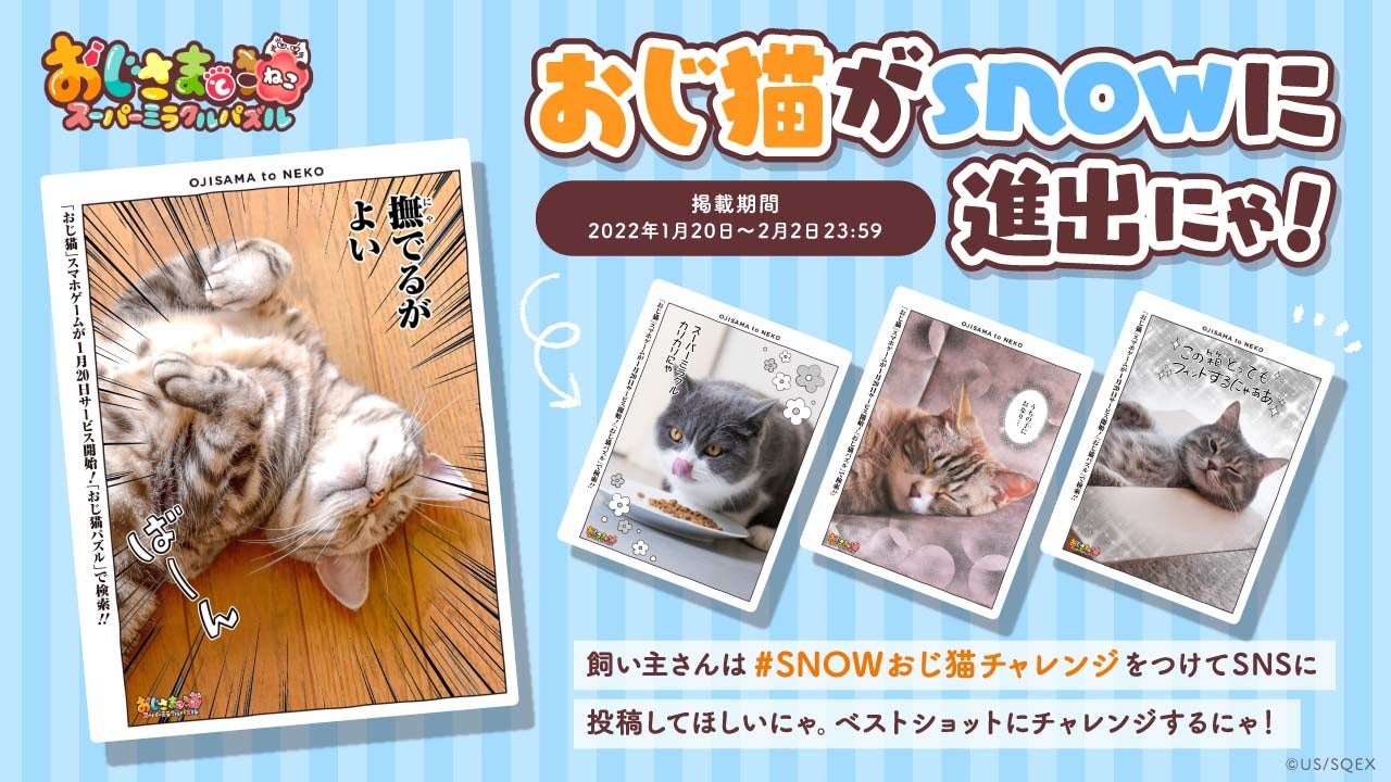 大人気カメラアプリ「SNOW」から「おじ猫パズル」専用スタンプが登場!「ふくまる」名セリフとあわせて、みんなのご自慢の猫写真を撮影しよう!愛猫だけじゃなく、ワンちゃんや人でも楽しめる!【#SNOWおじ猫チャレンジ】を付けて、SNSに画像を投稿しよう!