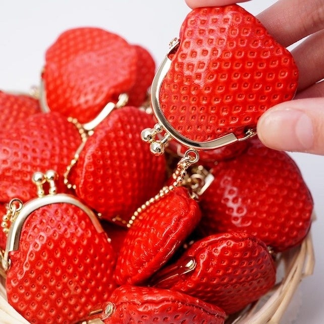 色や凹凸、種粒も含めて本物のいちごそっくりのミニがま口小銭入れ。すべて日本の老舗タンナーと共同で開発・製造している、メロンやいちごなどのフルーツモチーフの革製品が人気です。
