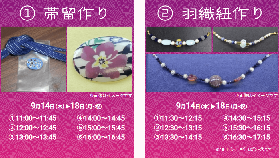 オリジナルの帯留めと羽織紐をご自身で作れる人気の楽しいイベントです。