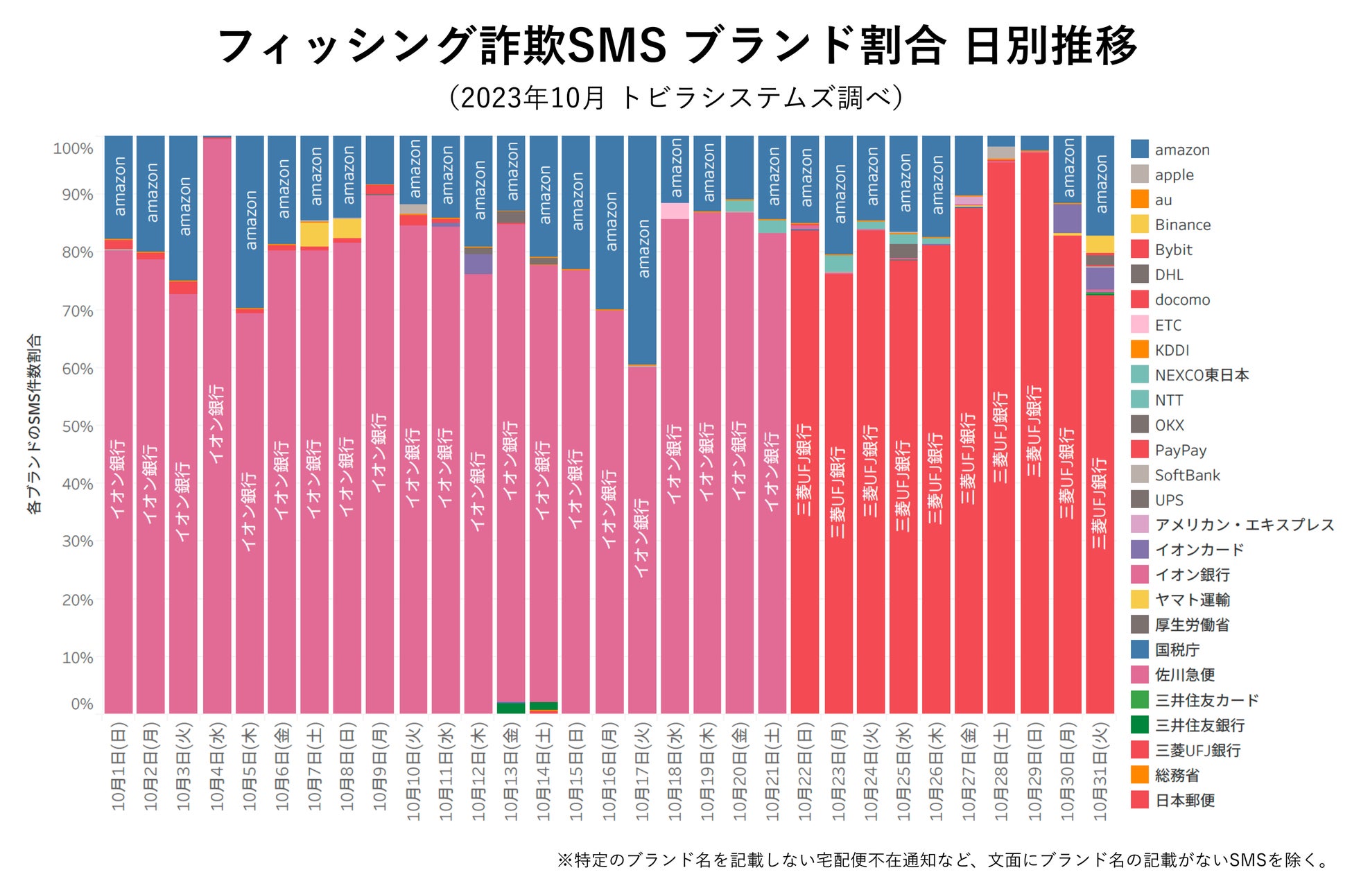実在する企業やブランドの名前をかたるフィッシング詐欺のSMSについて、2023年10月は「イオン銀行」「三菱UFJ銀行」をかたるフィッシング詐欺のSMSが目立ち、日別割合の8割近くを占めています。10月21日までは「イオン銀行」をかたる文面が顕著でしたが、10月22日からは「三菱UFJ銀行」をかたる文面に切り替わり、その後継続的に発生しています。