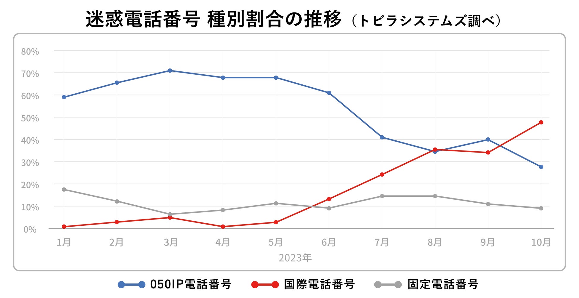国際電話番号を利用した特殊詐欺が急増しています。トビラシステムズの調査で、2023年10月に新たに確認された迷惑電話番号の種別割合は、国際電話番号の割合が50%近くまで増加し、IP電話番号(050番号)を大きく上回りました。