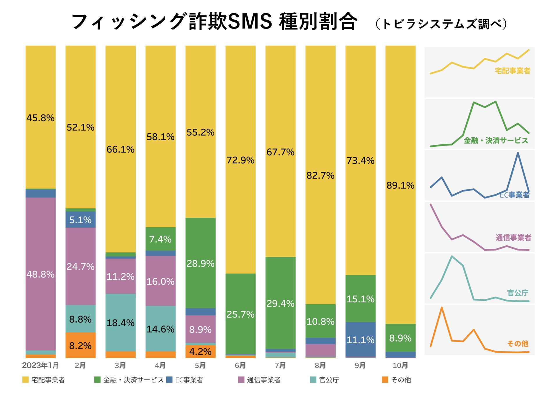 トビラシステムズの調査で、2023年10月に確認されたフィッシング詐欺のSMSの種別割合は、宅配事業者をかたる手口が89.1%を占め、今年最も大きな割合となりました。