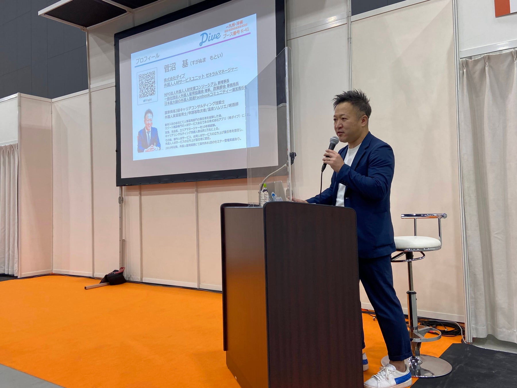 全国約4,600箇所の宿泊施設へ人材派遣・紹介事業を行う株式会社ダイブ(東京都新宿区 代表取締役:庄子潔 以下、ダイブ)は、一般社団法人日本能率協会が11⽉15⽇(火)・11月16日(水)に開催する「第4回九州・沖縄 観光・宿泊外食産業展2022」にダイブ 外国人人材サービスユニット ゼネラルマネージャー・菅沼 基が登壇しました。