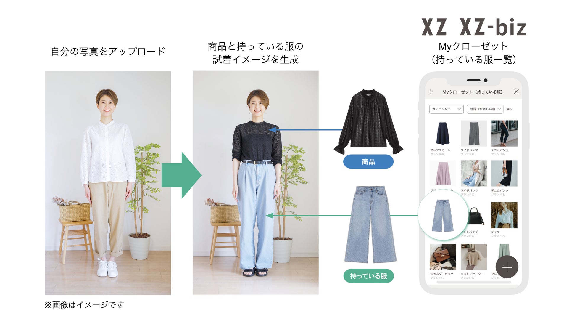 本共同研究では、当社の生成AIノウハウを活用したバーチャル試着技術をSTANDING OVATIONが提供するオンライン・クローゼットのプラットフォーム 「XZ」(BtoCアプリ) および「XZ-biz」(BtoBサービス) に提供、サービス化を目指します。実際に試着することなく、オンライン上で利用ユーザーが自分の「持っている」服や「気になる商品」から自分に似合うコーディネートを確認することができるほか、特定のトレーニングデータに依存せずに多様な服装をリアルに再現することができます。