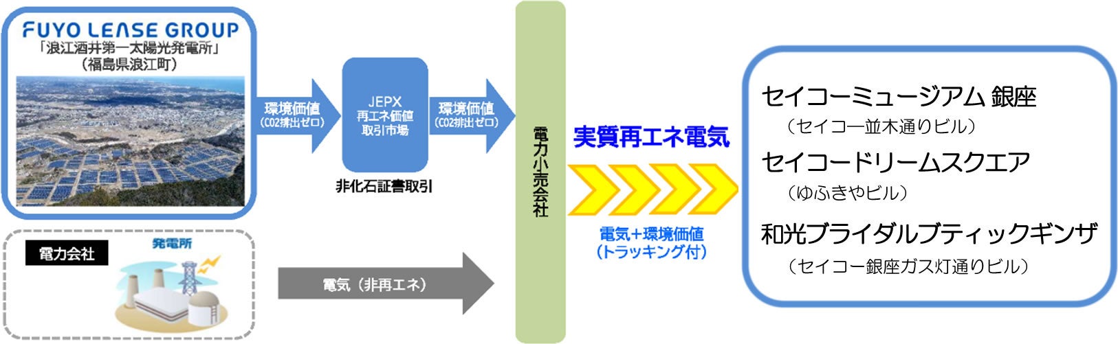 「浪江酒井第一太陽光発電所」を由来とする環境価値を裏付けとしたトラッキング付FIT非化石証書を購入することで、震災復興に向けクリーンエネルギーを活用した街づくりに取り組む福島県浪江町で発電された再生可能エネルギーが、セイコーグループ創業の地である銀座に所在する各施設において利用されることになります。