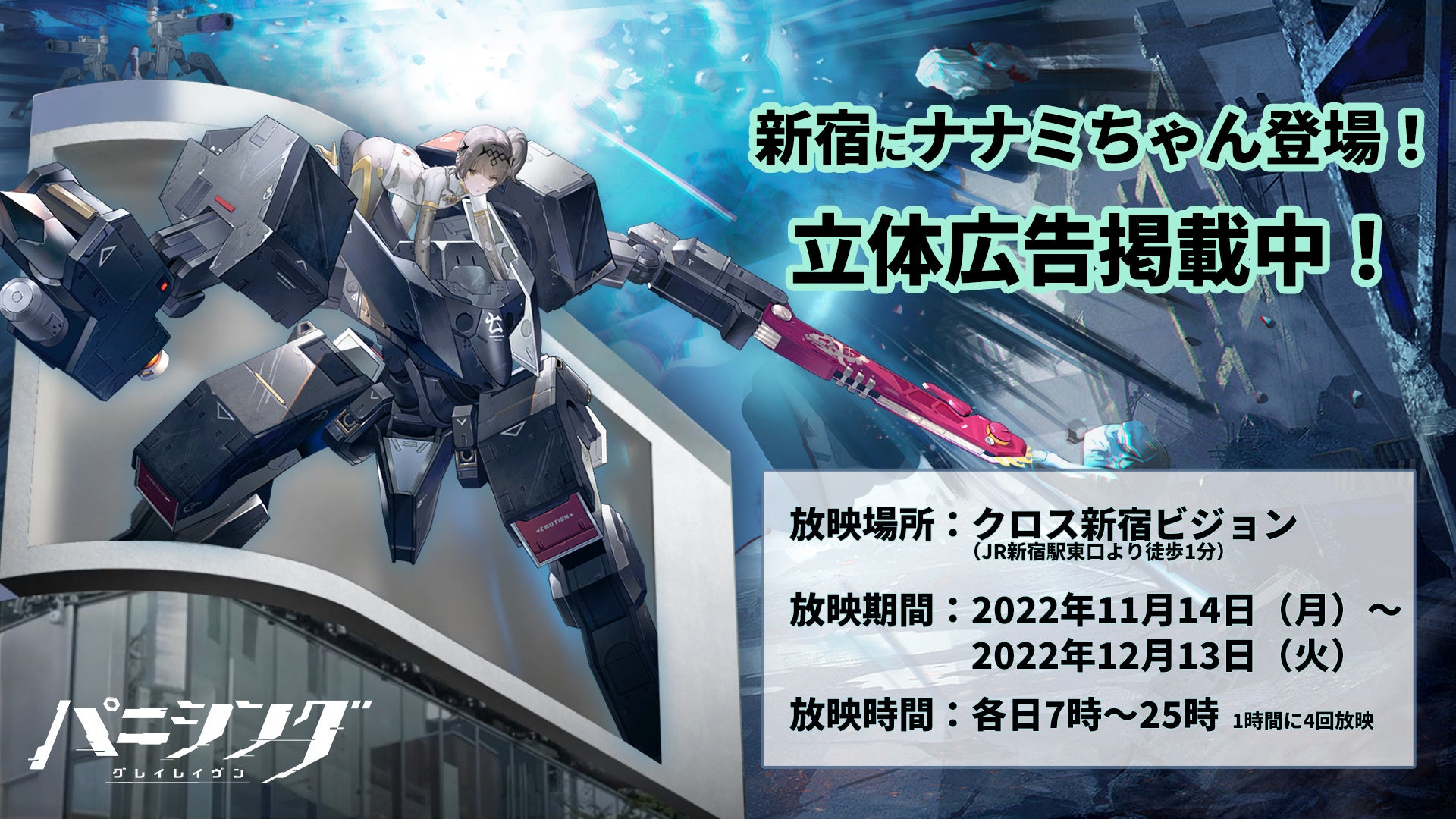 JR新宿駅東口付近に設置されている街頭ビジョン「クロス新宿ビジョン」にて、「パニシング:グレイレイヴン」初となる立体広告を本日より公開!新規キャラクター「ナナミ・遥星」が登場する迫力ある映像をどうかお楽しみください。
