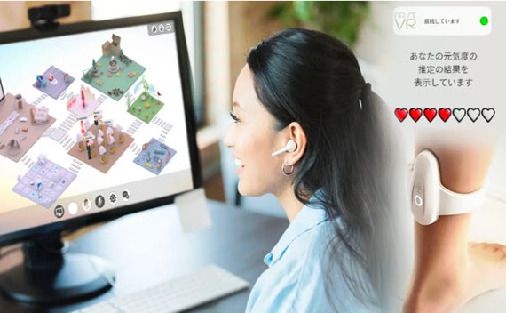BodySharing®技術によって感覚を共有し、デュアルワークの課題解決を目指すメタバースオフィス「BodySharing® for Business」のデモを展示します。体験者は、筋変位センサ「FirstVR」をふくらはぎに装着し、「元気度(肉体疲労の度合い)」と、「リラックス度(緊張の有無)」をメタバース空間上でアバターに即時反映させます。