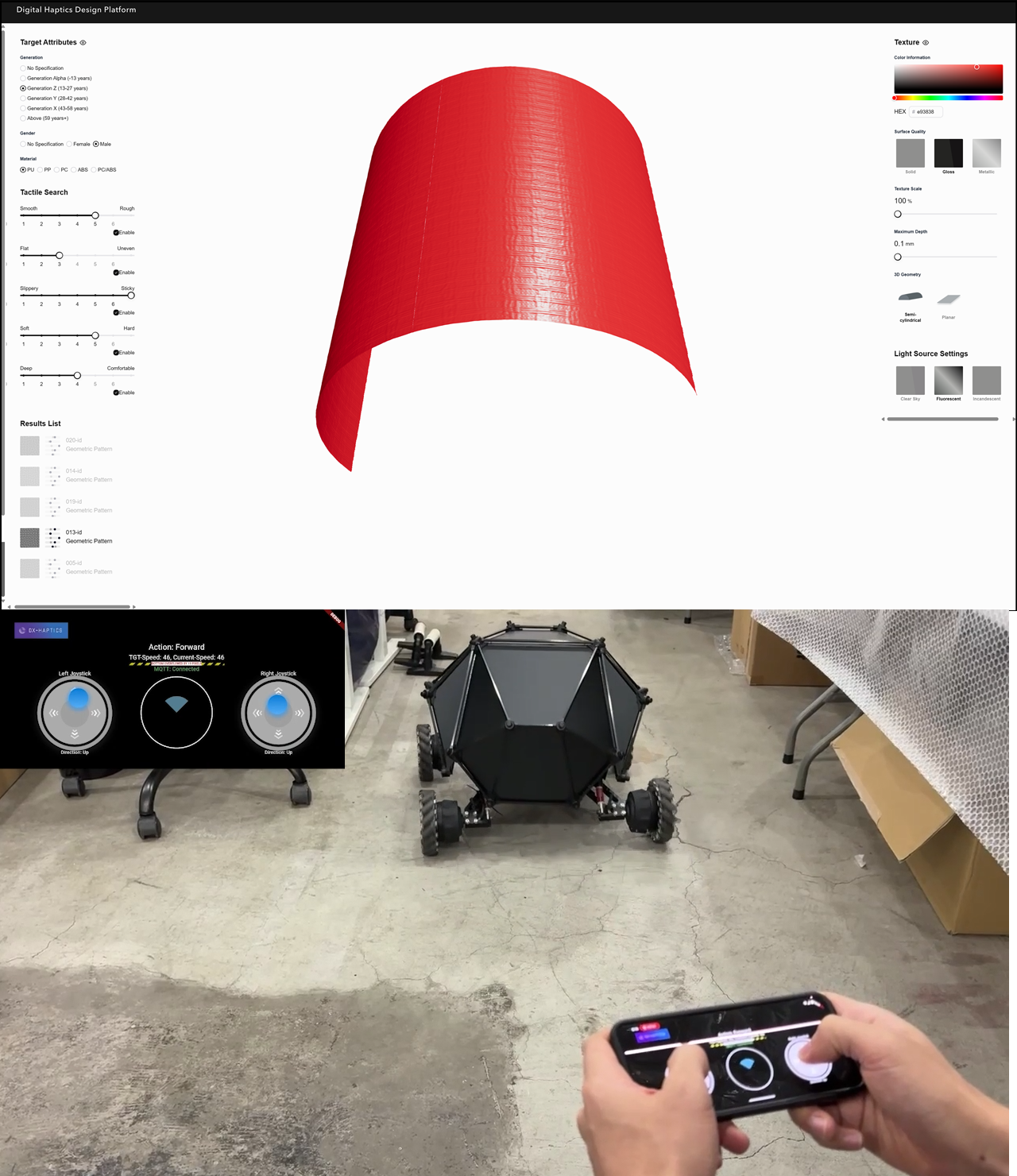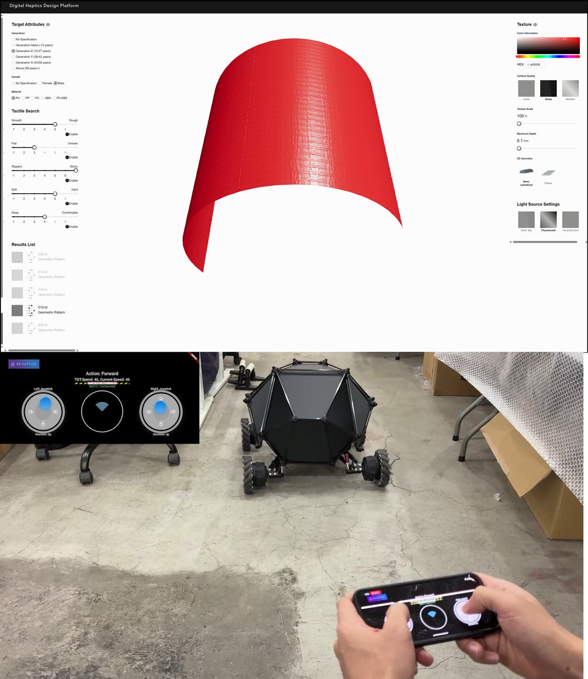 プロダクトデザインにおける触感バリエーションを、実際に触れていただける触感サンプルの展示や、プラットフォームのプロトタイプをつかった、触感推定・生成の実動デモにより説明します。