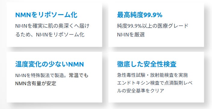 医療機関などでも採用されている基準を満たしたNMNを贅沢に配合。NMNの浸透をサポートし、うるおいを長時間保つことを目指した次世代型スキンケア。