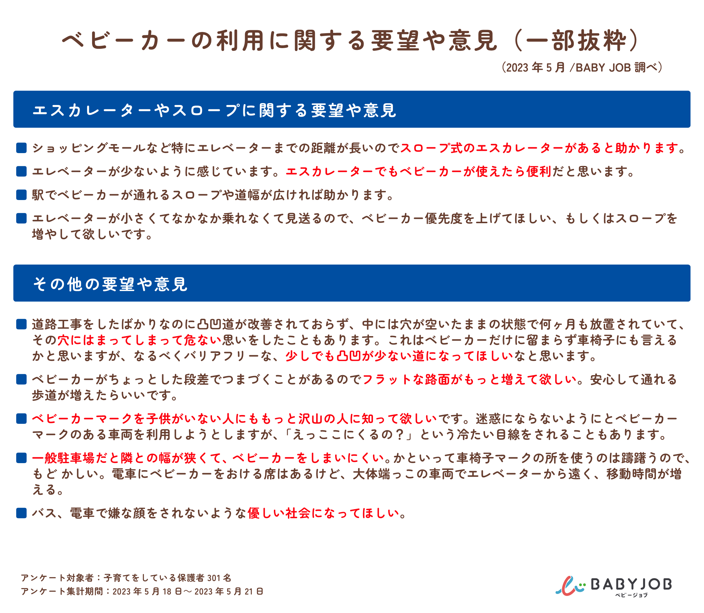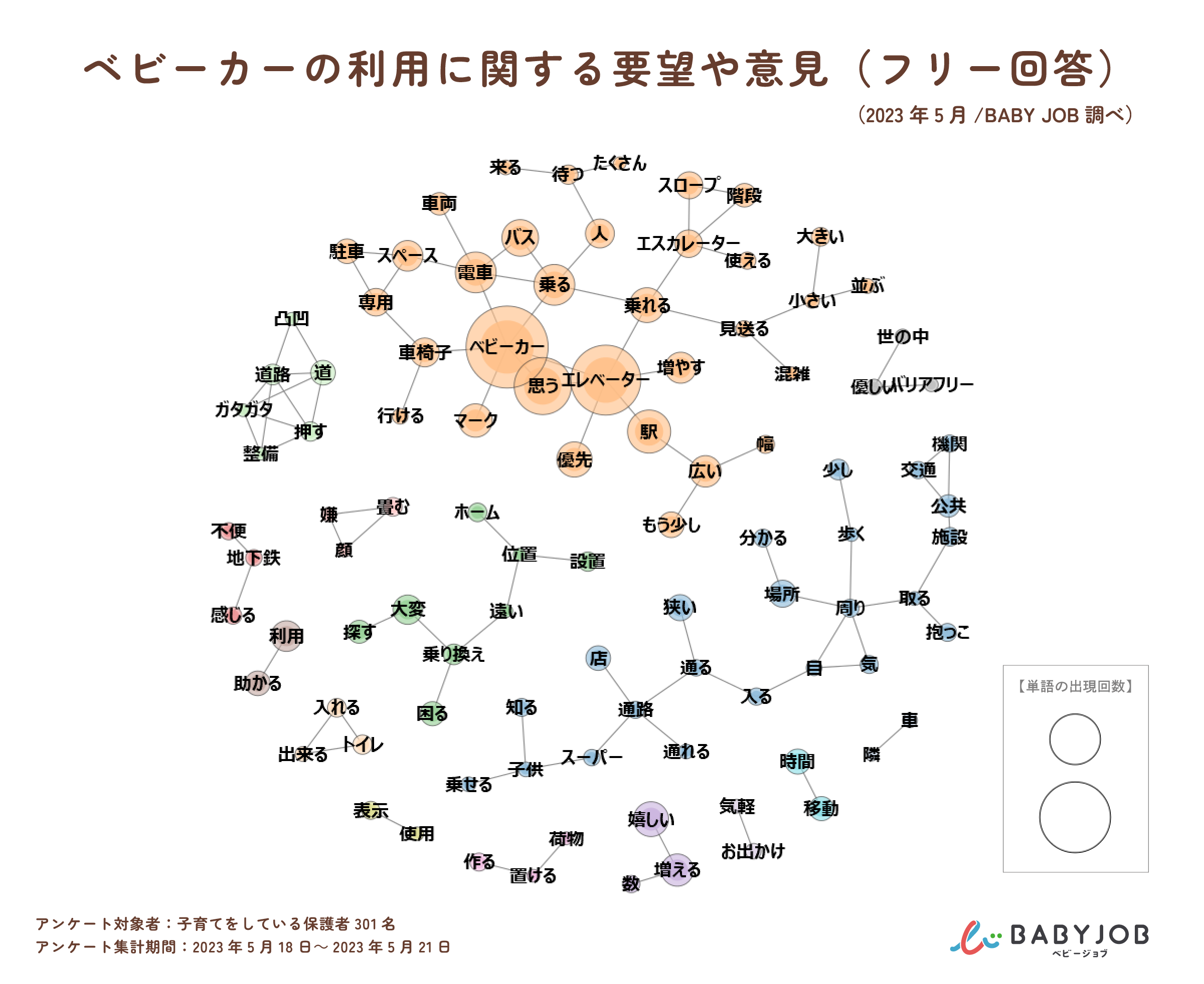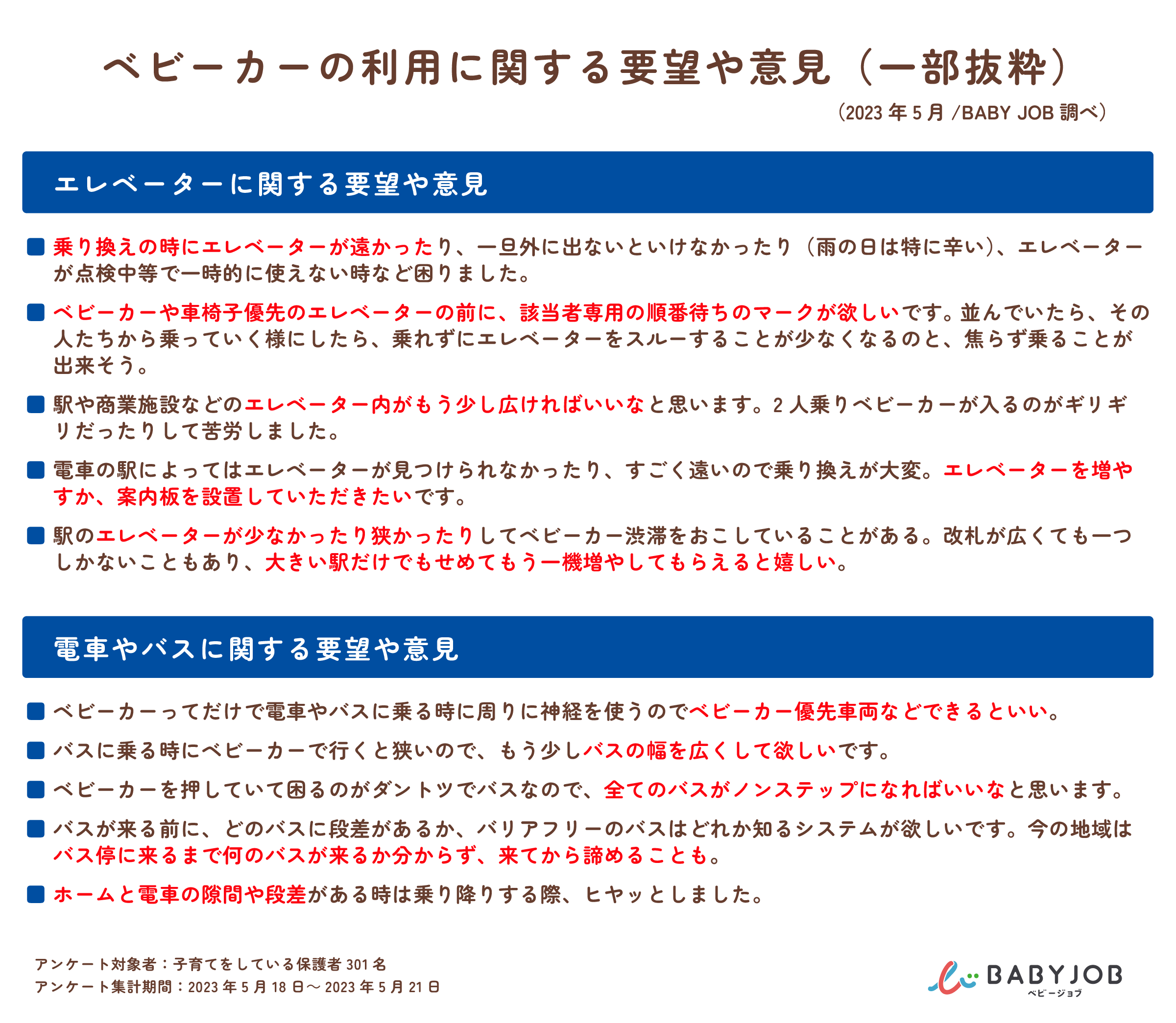 ベビーカーの利用に関する要望や意見をフリー回答で尋ねたところ、47.2%もの保護者がエレベーターに関する改善を期待していることがわかりました。