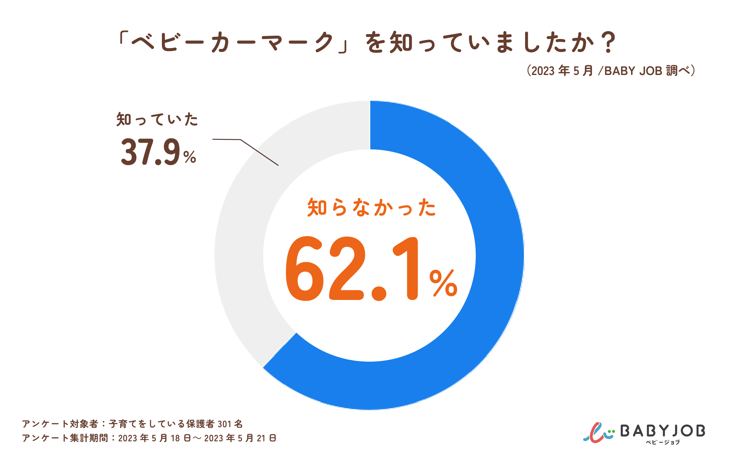 BABY JOBが全国の保護者301名を対象に「ベビーカー」に関するアンケート調査を行った結果、「『ベビーカーマーク』を知っていましたか?」という質問に対して「知っていた」と回答した保護者はたったの37.9%でした。政府の調査によると、ベビーカーマークの令和4年7月における認知度は43%となっていますが、本来の対象であるはずの子育て中の保護者に限定したアンケートではそれを下回る結果となりました。「ベビーカーマーク」が作られた2014年から9年経っても未だに多くの人に認知されていないことが明らかになりました。