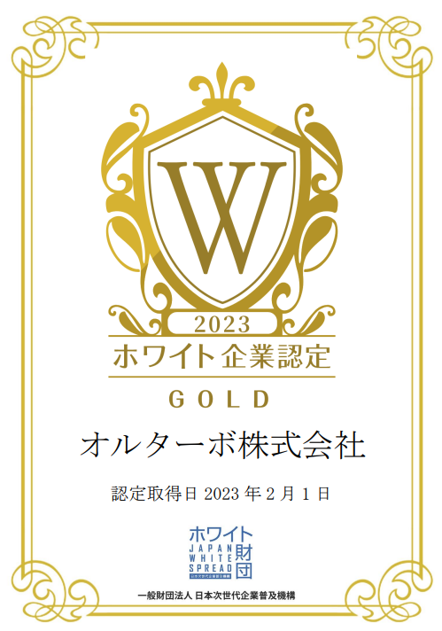 オルターボ株式会社は2023年2月1日に「ホワイト企業認定 ゴールド」を取得されました!素晴らしい取り組み内容は、「ホワイトキャリア(ホワイト企業が集まる就活情報サイト)」にてインタビューページを公開しています。