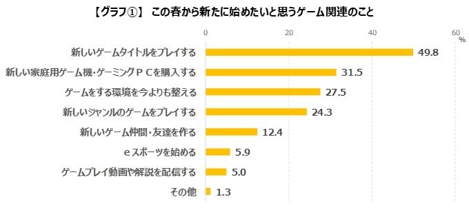 続いて「新しい家庭用ゲーム機・ゲーミングPCを購入する」が31.5%、「ゲームをする環境を今よりも整える」が27.5%と続きます。新年度というタイミングで、今までプレイしてきた環境をさらに整えたいと考えているゲーマーが多く見られ、ゲームを今まで以上に楽しみたいと考える前向きな様子がうかがえます。【グラフ①】