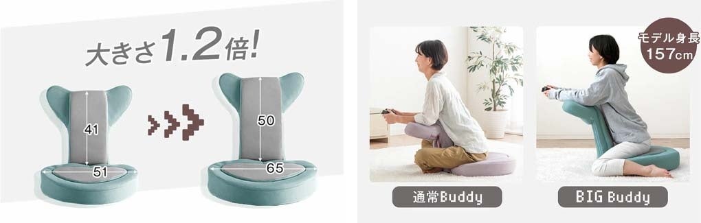 通常の”Buddy”(座面幅51cm/背もたれ高さ41cm)と比べ”BIG Buddy”は1.2倍サイズアップ(座面幅65cm/背もたれ高さ50cm)しています。
