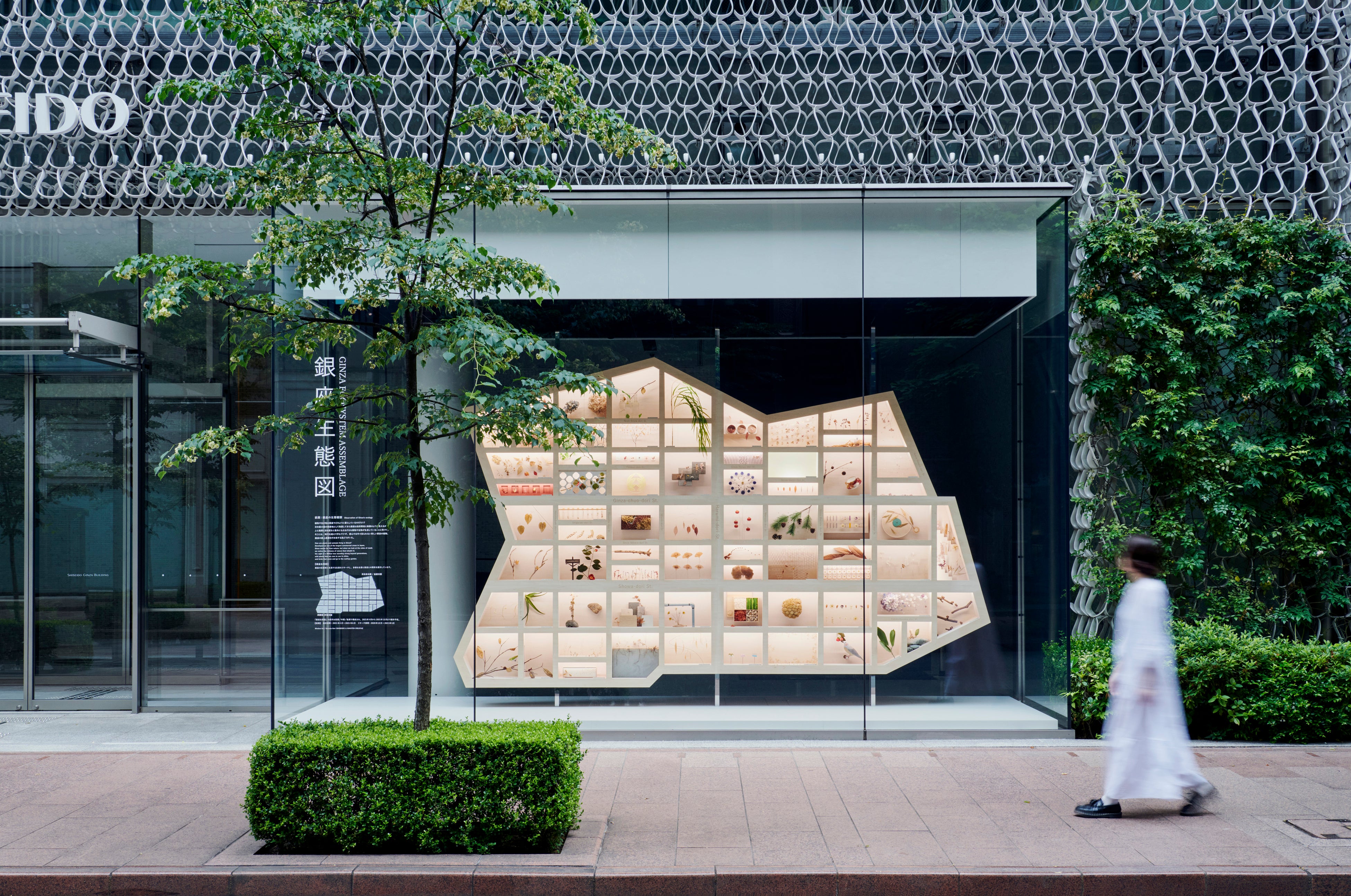 ウィンドウには、銀座の街を模した全72区画の棚を設置し、フィールドワークによって採取した植物や土壌、さらには人の営みにまつわるものを素材にした作品を2021年4月〜2022年4月の期間を通して展示しました。銀座は資生堂の創業の地であり、同じ地域に本社を構える当社と共創し、当プロジェクトを通して、地域とつながるコミュニケーションの活性化を目指しました。