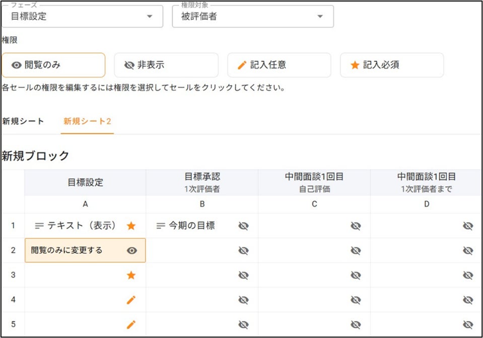 評価シート内のパーツごとに閲覧・編集・非表示の権限を設定でき、外部評価者が含まれる場合でも安全に運用できます。