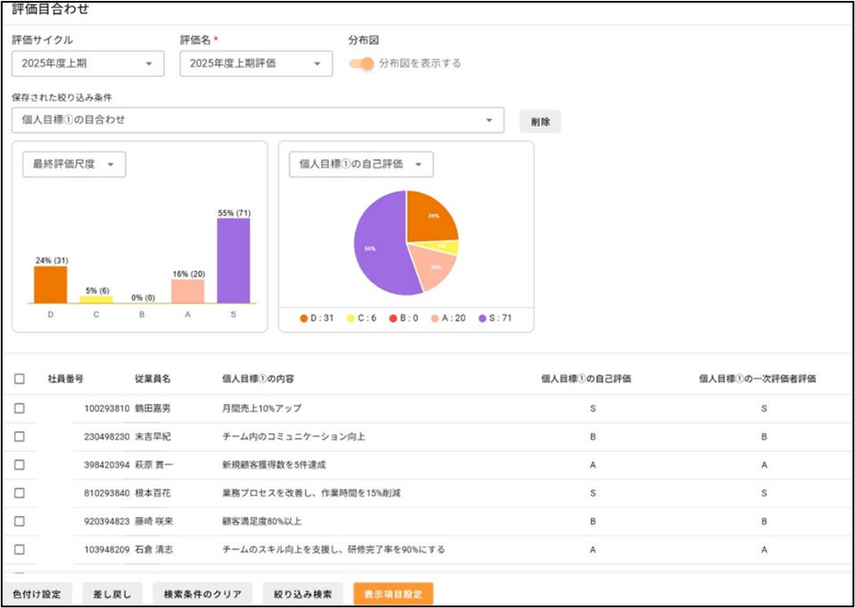 評価者ごとの甘辛傾向を可視化し、強制分布やグラフ表示で公平性を確保。