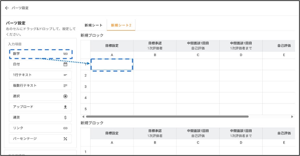 目標・コンピテンシー・計算式などをパーツ化し、行列の追加や複数レイアウトを選択可能。