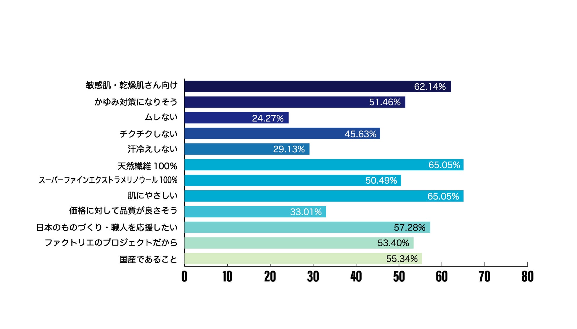 サイト上のポイントで購入意志に関与したワードを聞いたところ、1位が「肌にやさしい」「天然繊維100%」が同率で65.5%。3位が「敏感肌・乾燥肌さん向け」で62.14%という結果に。