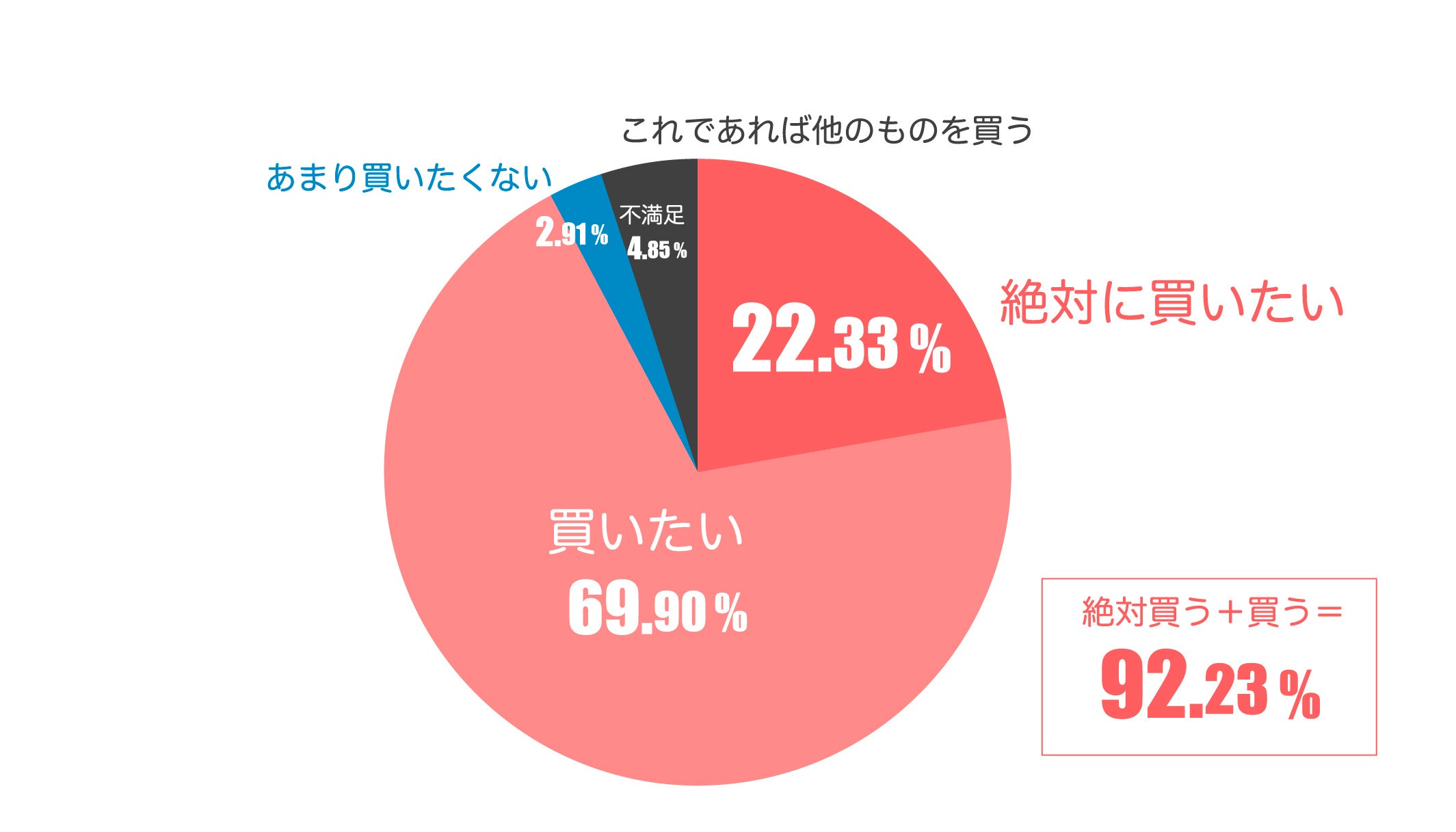 - 「絶対に買いたい」と「買いたい」を合わせて92.23%とリピート意向の高い結果に。肌悩み別の1位は「超乾燥肌」の人で97.44%。