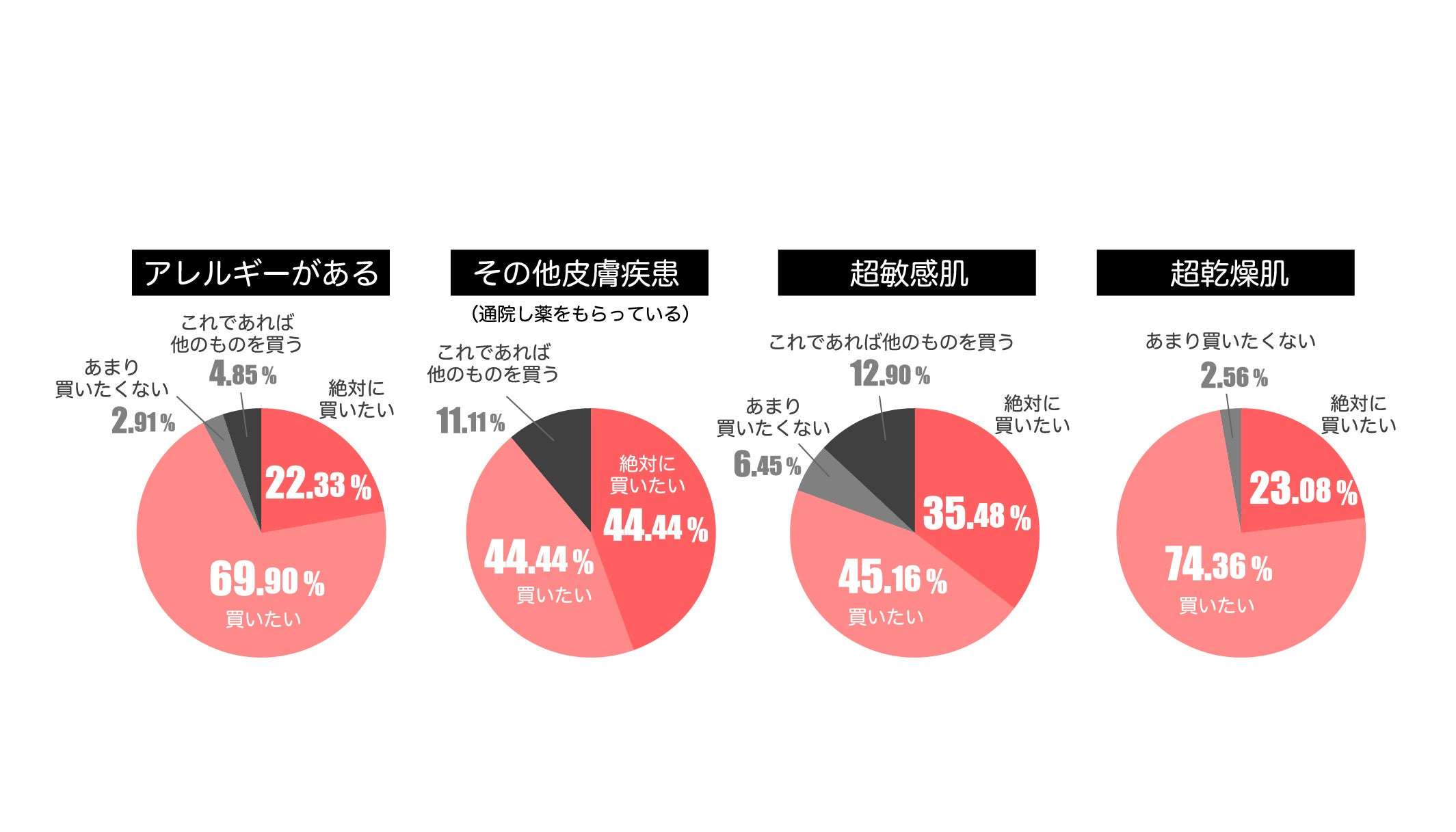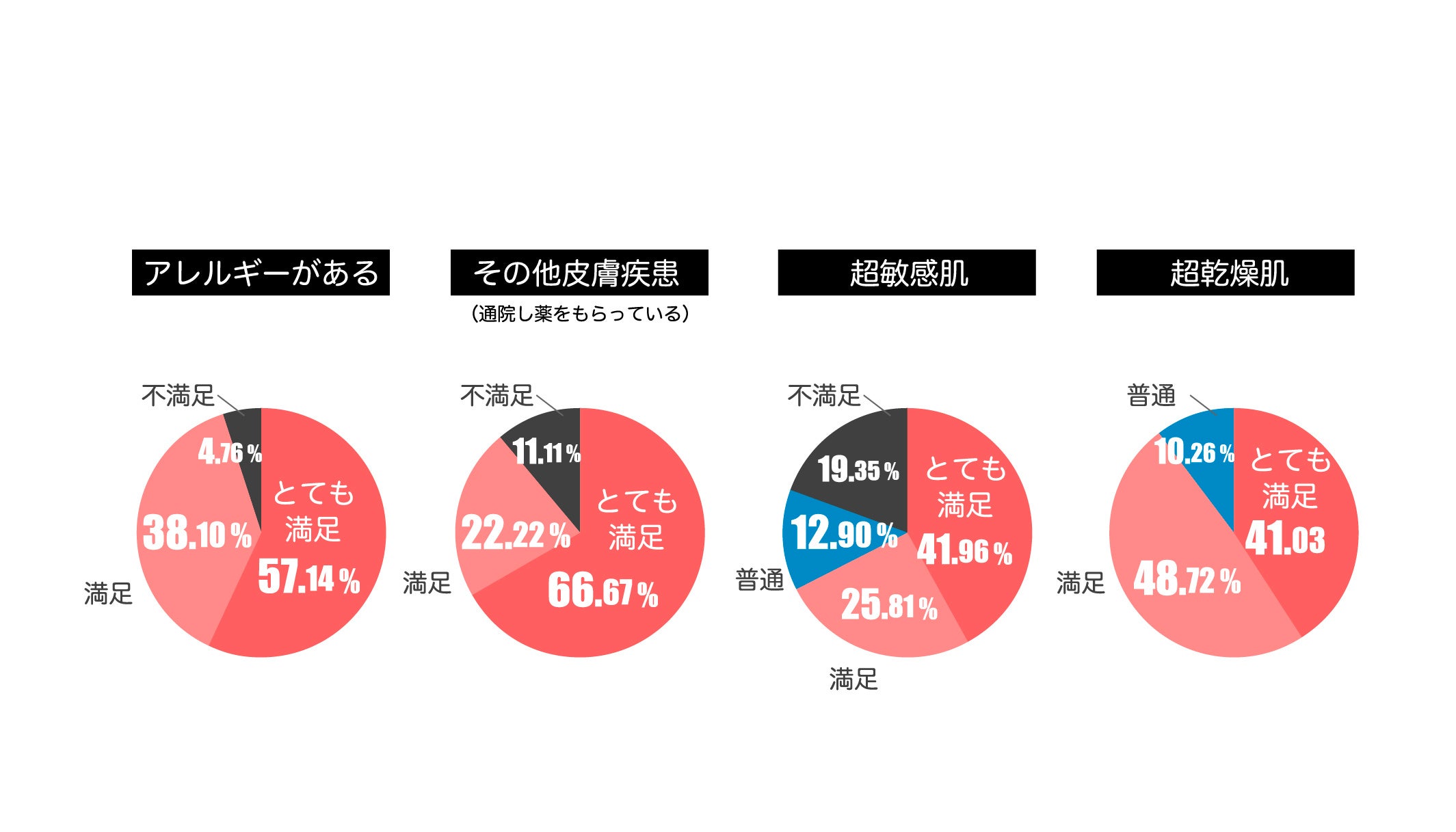 肌悩み別に見ると1位が「アレルギーがある」人の95.24%と最も高く、続いて「超乾燥肌」97.44、「その他皮膚疾患がある人」88.88と続きました。より普段のかゆみなどの症状がある人の満足度が高い結果となりました。