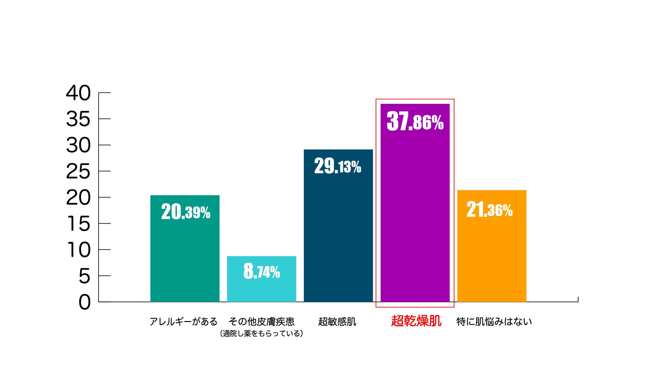 - 何かしらの肌悩みを抱えている人が約80%にものぼる。肌悩みの1位は「超乾燥肌」の37.86%。