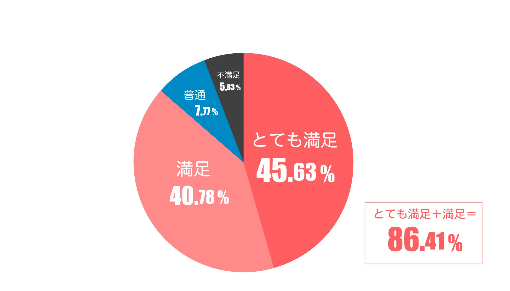 - 「とても満足」と「満足」を合わせて86.41%の人が満足したと回答。肌悩み別の1位は「超乾燥肌」の人で97.44%