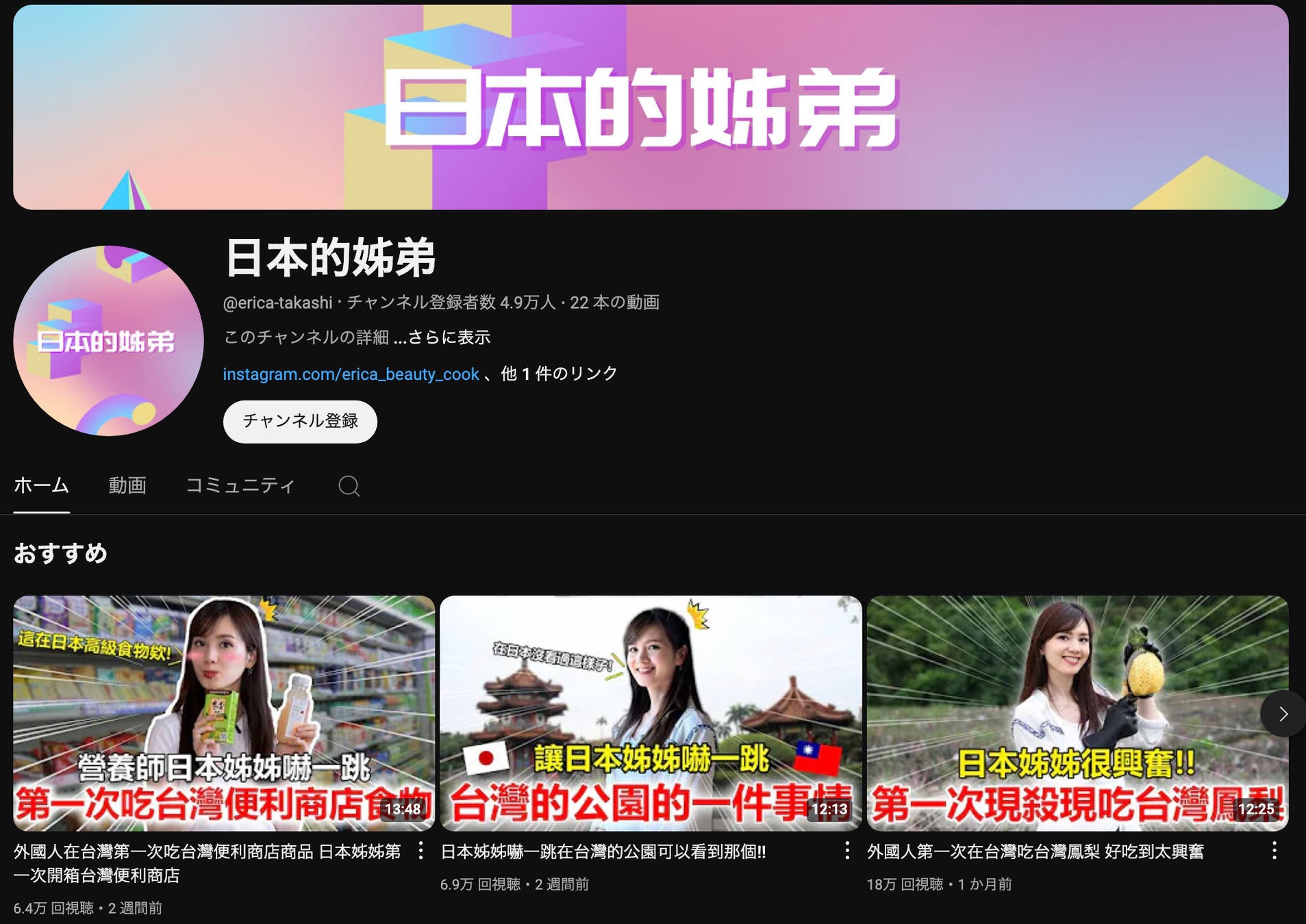 松野氏のSNS活動は、YouTubeではグルメや旅をメインに、Instagramでは美容と健康に関するコンテンツを発信しています。YouTube「日本的姊弟」チャンネルでは、台湾現地の魅力を発信し4.9万人のフォロワーを持ち、Instagramでは1.3万人のフォロワーを有しています。彼女の活動は美容や食、文化交流を軸に、日台両国で多くの支持を得ています。