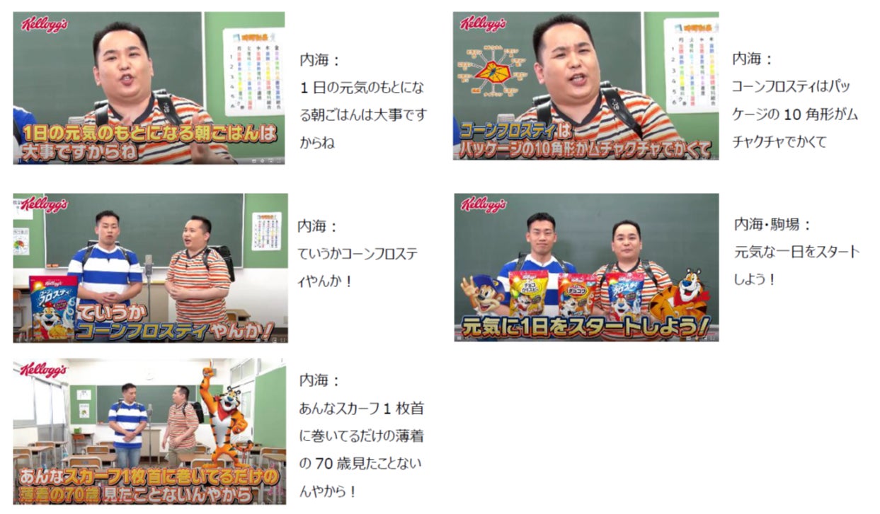 漫才では、駒場さんの小学生のいとこがテンションが上がる朝ごはんを忘れしまい、内海さんが一緒に考えてあげるコーンフレーク漫才おなじみの設定でスタート。甘くてカリカリしてて牛乳をかけて食べるという特長を言った後に、「コーンフレークやないか!」とツッコミますが、「マラソン中に食べたい物ランキングで1位やって言うねんな」という特長には、「ほなコーンフロスティちゃうやないか!マラソン中にあんなカラカラなもん食えへんのやから」とツッコみを披露しています。さらに、「選ばれし勇者しか作れないらしい」という特長を言った後には、「コーンフロスティちゃうやないか!コーンフロスティは子どもでも簡単に作れるとこが魅力やねん。選ばれし勇者しか作られへんかったら、モンスターと戦っている間に学校に遅刻してしまうよ」と小学生らしいトピック満載で軽快にツッコミを入れていきます。最後には、はとこも登場し、「枝豆ちゃうか?」とおきまりの頓珍漢なメニューに内海さんがツッコむ様子で締めくくられています。「朝食応援漫才」カットシート