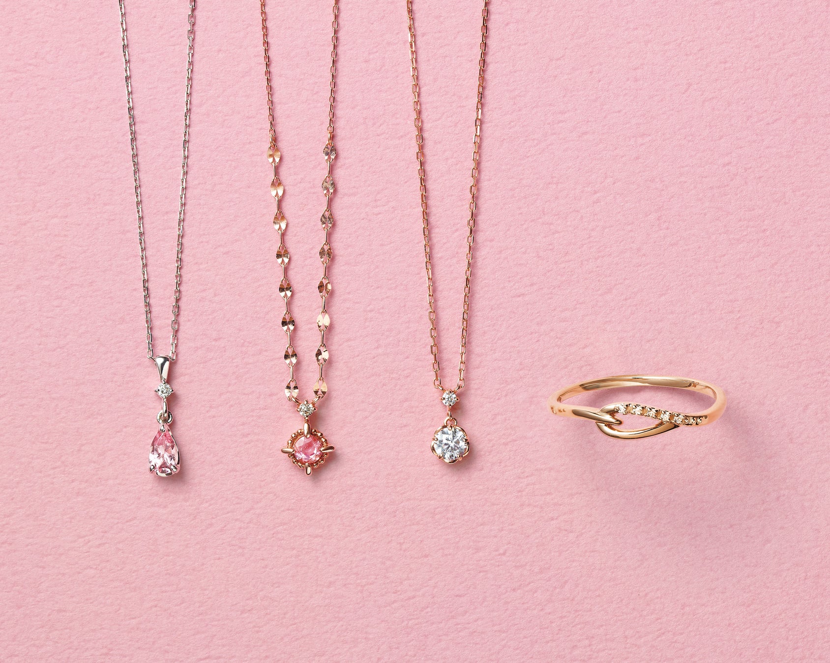 ピンクトルマリンやピンクゴールドを使用したベーシックなネックレス、リボンをモチーフにしたリングなどの新作が登場。