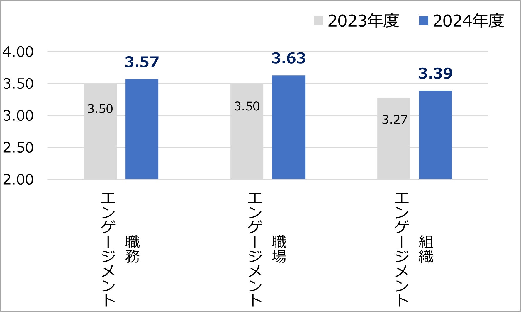 まず全体では、前回調査時より今回調査の方が、平均値がやや高くなっている。項目ごとに見ると「職務エンゲージメント」は3.57、「職場エンゲージメント」が3.63、「組織エンゲージメント」は3.39で、前回調査時と同様に「組織エンゲージメント」は他2項目よりやや低くなっている。