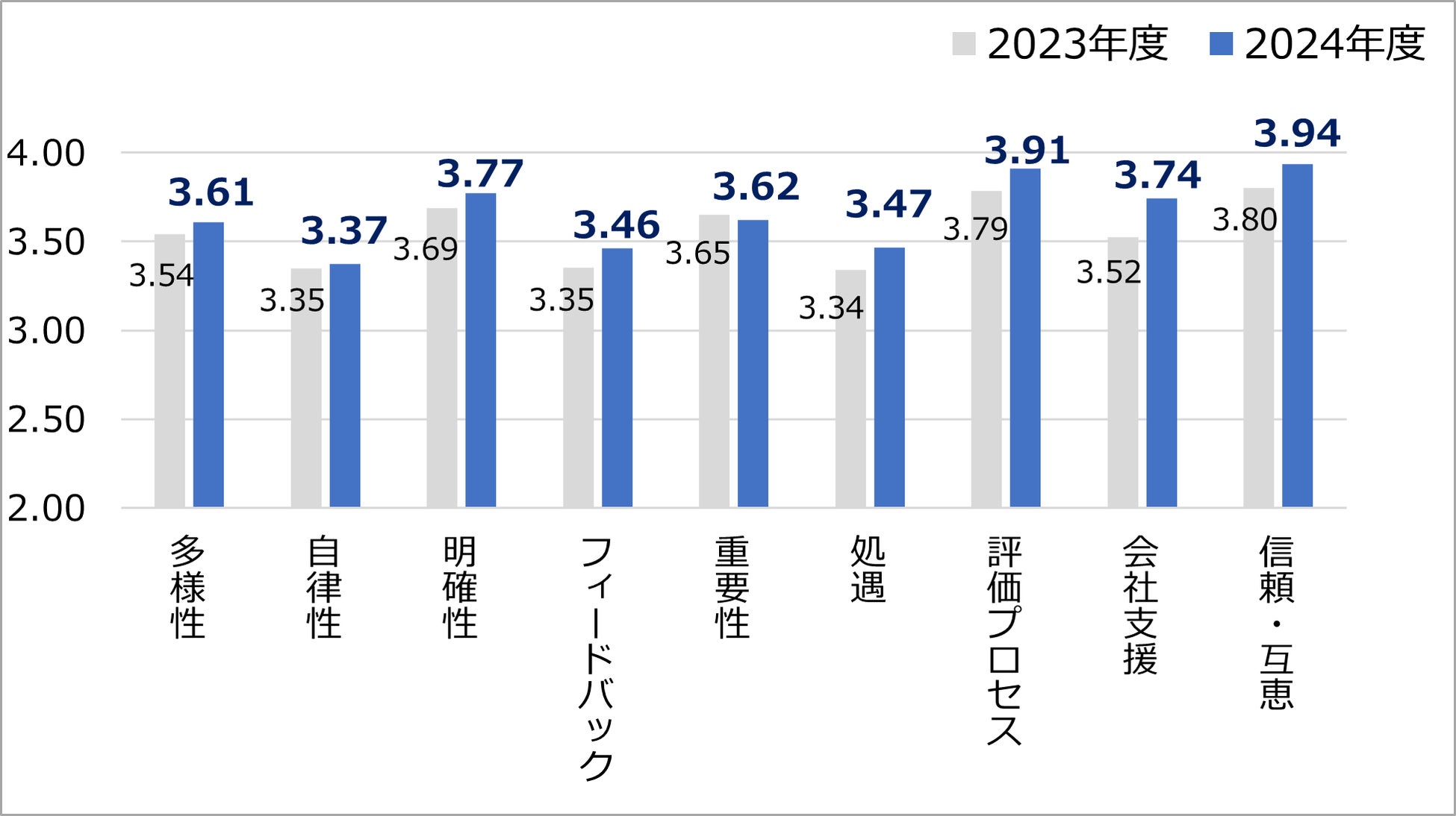 今回調査(2024年度)と前回調査(2023年度)の結果について、各調査に参加した新入社員全員の平均値を比較すると、9つの項目ほぼ全てで前回より今回の方が高い値となっており、レベル3~4の間にあることが分かる。なかでも「会社支援」は前回の3.52から3.74へと、0.22ポイントも向上している。