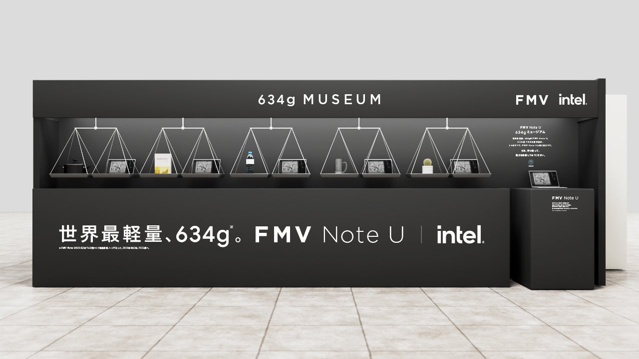 イベントスペースでは、約634g の「FMV Note U(UX-K3)」と同重量の様々な商品を展示する「634gミュージアム」を用意しています。世界最軽量のパソコンの軽さをぜひ体験ください。