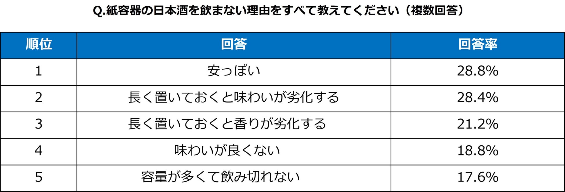 紙パックの日本酒が敬遠されるのは、「安っぽい」に加えて、「長く置いておくと味わいや香りが劣化する」ことも大きな理由の一つであることがわかりました。「容量が多くて飲み切れない」が、同じく上位の理由にあげられていることから、大容量が中心の紙容器はすぐに飲み切ることができず、どうしても長い間置いておかれがち、という事情が背景にあるのではと見られます。