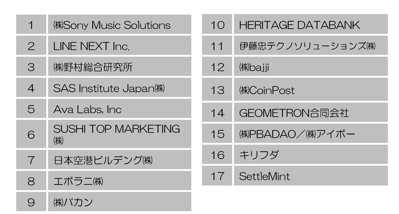 キリフダ、株式会社bajji、株式会社バカン、Settle Mint、株式会社ハシラス、株式会社エム・ディ・シー、GEOMETRON合同会社、LINE NEXT Inc.、HERITAGE DATABANK