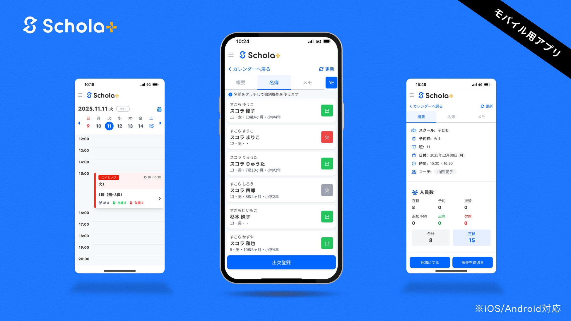 スタッフ向けモバイル用アプリ:出欠登録やスケジュール確認、休講振替設定に対応