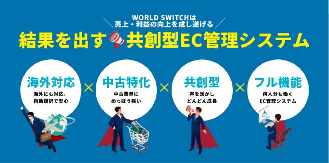 「WORLD SWITCH」は一括出品・受注、買取管理・在庫連携を備えた、簡単に複数モール管理ができる中古品業者特化型ECショップ一元管理システムです。各作業での時間短縮、業務の現状を劇的に改善し効率化することで、ショップの売上・利益の向上を図ります。