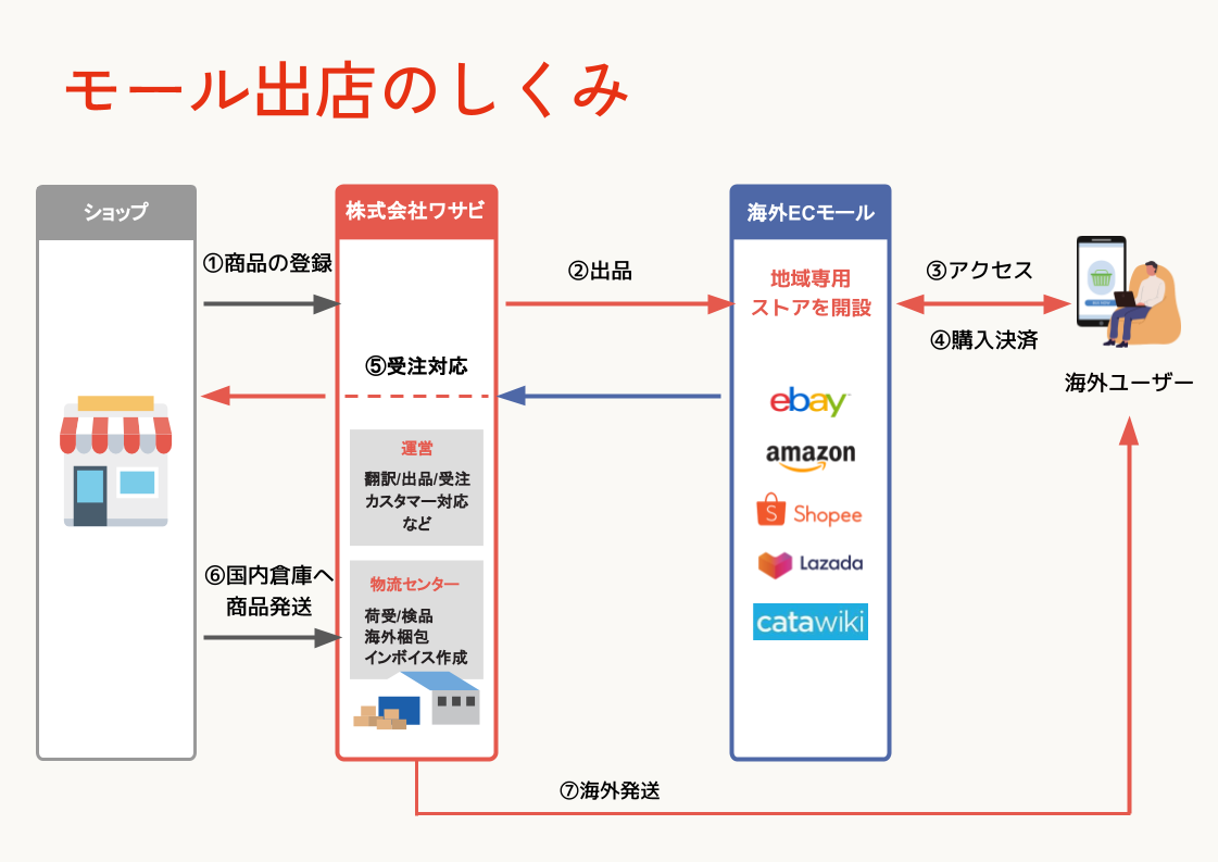 出品希望事業者様は、商品の登録と国内倉庫へ商品を納入するだけで海外販売ができます。