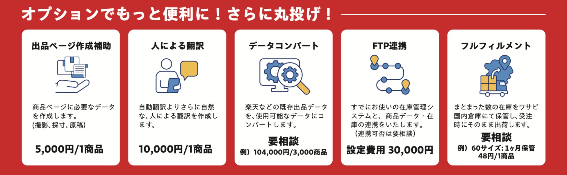 オプションメニューとして出品ページの作成、翻訳の補助などもご用意しています。