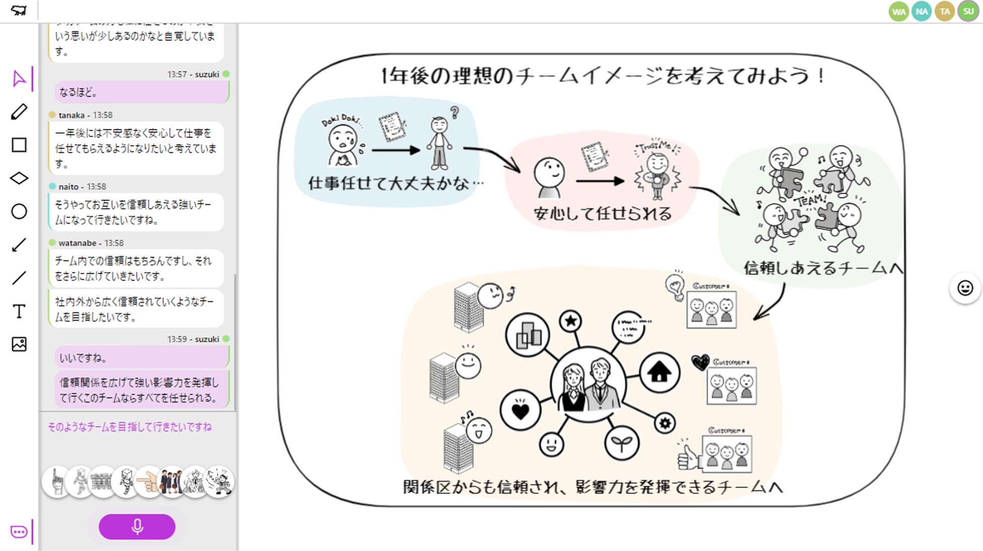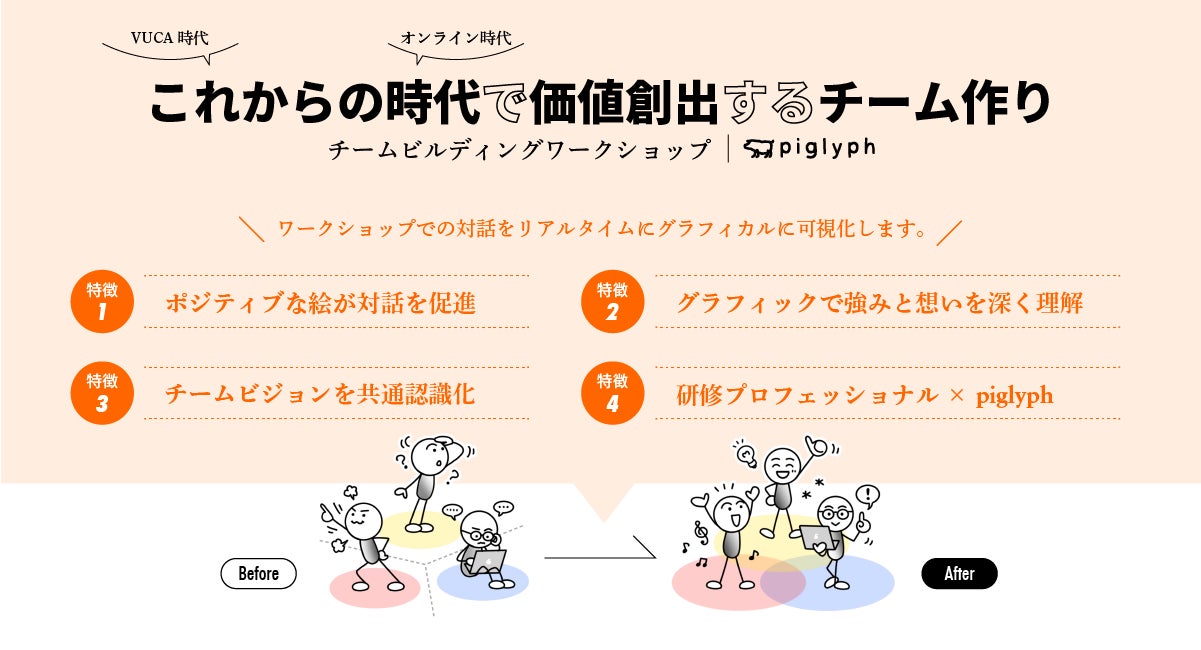 新サービスは、企業の社員研修やコンサルティングを手掛ける株式会社シェイクと共同開発した、piglyphを活用したチームビルディングワークショップです。社員研修専門のファシリテーターの進行のもとで、個々のメンバーのチームへの想いを対話の中で開示し、その対話をpiglyphでグラフィカルに可視化します。リアルタイムでの可視化は、参加者の間で共通認識を構築するとともに、オンラインでの発話のハードルを下げ、対話の活性化に貢献します。また、専門のファシリテーターが心理的安全性を確保する場をつくり、本質的な問いかけでメンバーに働きかけ、質の高いワークショップを提供します。本ワークショップを通じて、チーム全員が共通の理想像を持ちながら、高いレベルで成果創出が可能なチームづくりを実現します。