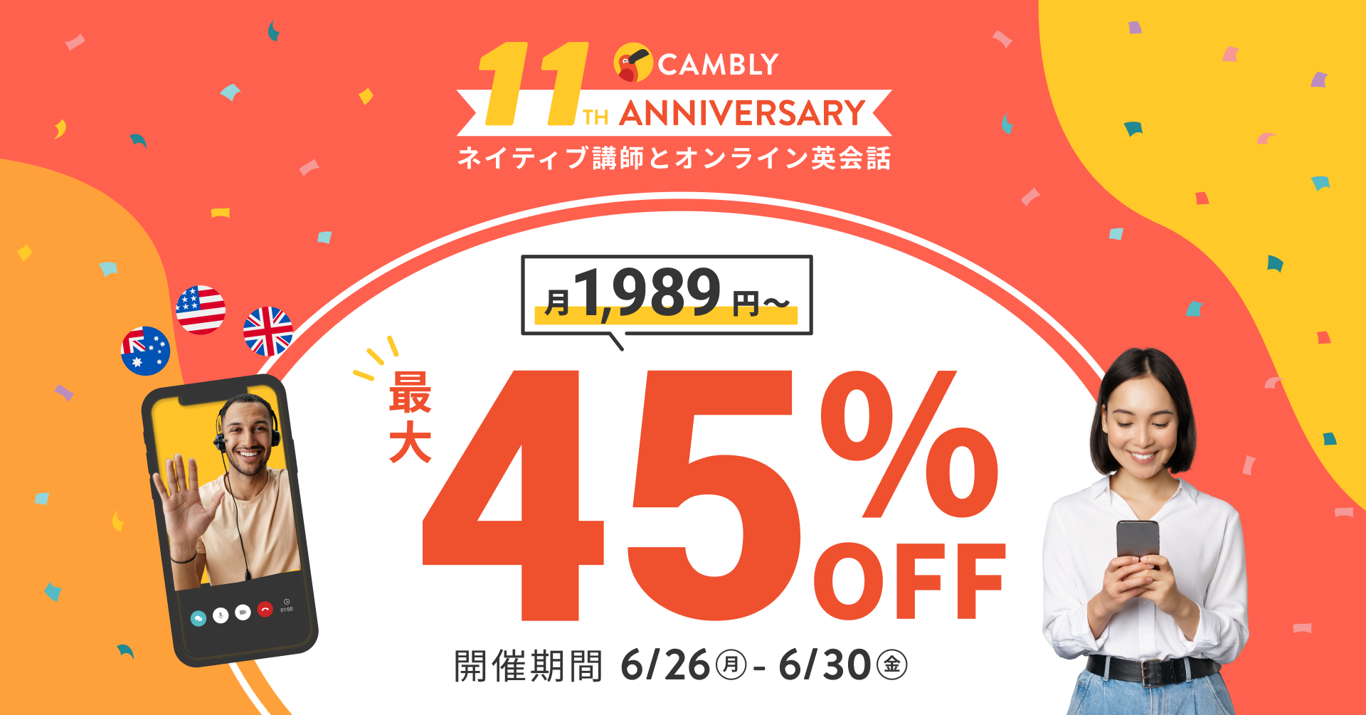 ネイティブ講師とのオンライン英会話サービス「Cambly(キャンブリー)」「Cambly Kids(キャンブリーキッズ)」を提供するCambly Inc.は、おかげさまで6月に11周年を迎えました。11周年を記念して様々なイベント・キャンペーンを開催してきたAnniversary monthの締めくくりは、全てのレッスンプラン対象の最大45%オフセール!