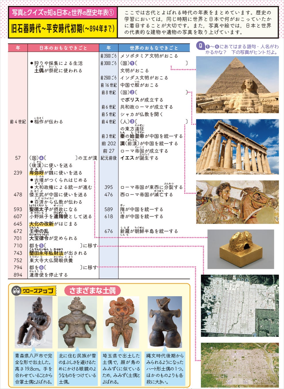 冒頭の口絵では、重要事項を年表で整理しながら、重要事項・人物と関係する写真を結びつける練習ができます。