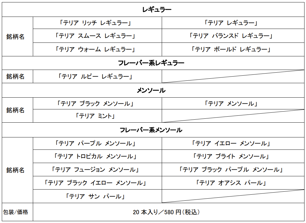 今回の「テリア ブラック トロピカル メンソール」の発売に伴い、テリア製品のラインアップは全20銘柄となります。