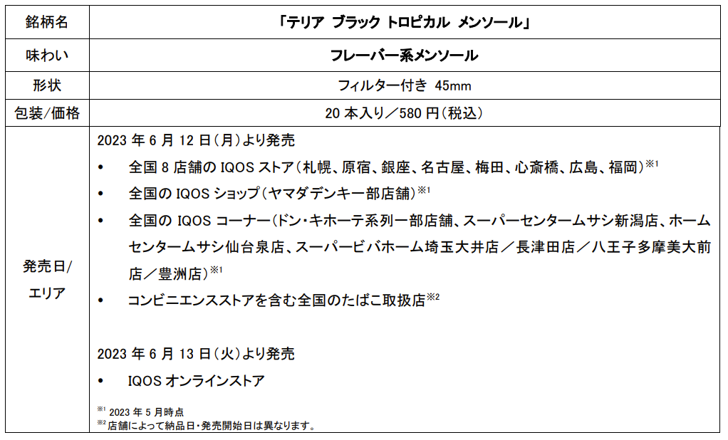 フィリップ モリス ジャパン合同会社(本社:東京都千代田区、社長:シェリー・ゴー、以下「PMJ」)は、加熱式たばこ IQOS ILUMA(イルマ)専用たばこスティック「TEREA(テリア)」から、「テリア ブラック トロピカル メンソール」を、2023年6月12日(月)より、全国8店舗のIQOSストア※、IQOSショップ(ヤマダデンキ一部店舗)、IQOSコーナー(ドン・キホーテ系列一部店舗他)、コンビニエンスストアを含む全国のたばこ取扱店で、2023年6月13日(火)よりIQOSオンラインストアにて順次発売いたします。